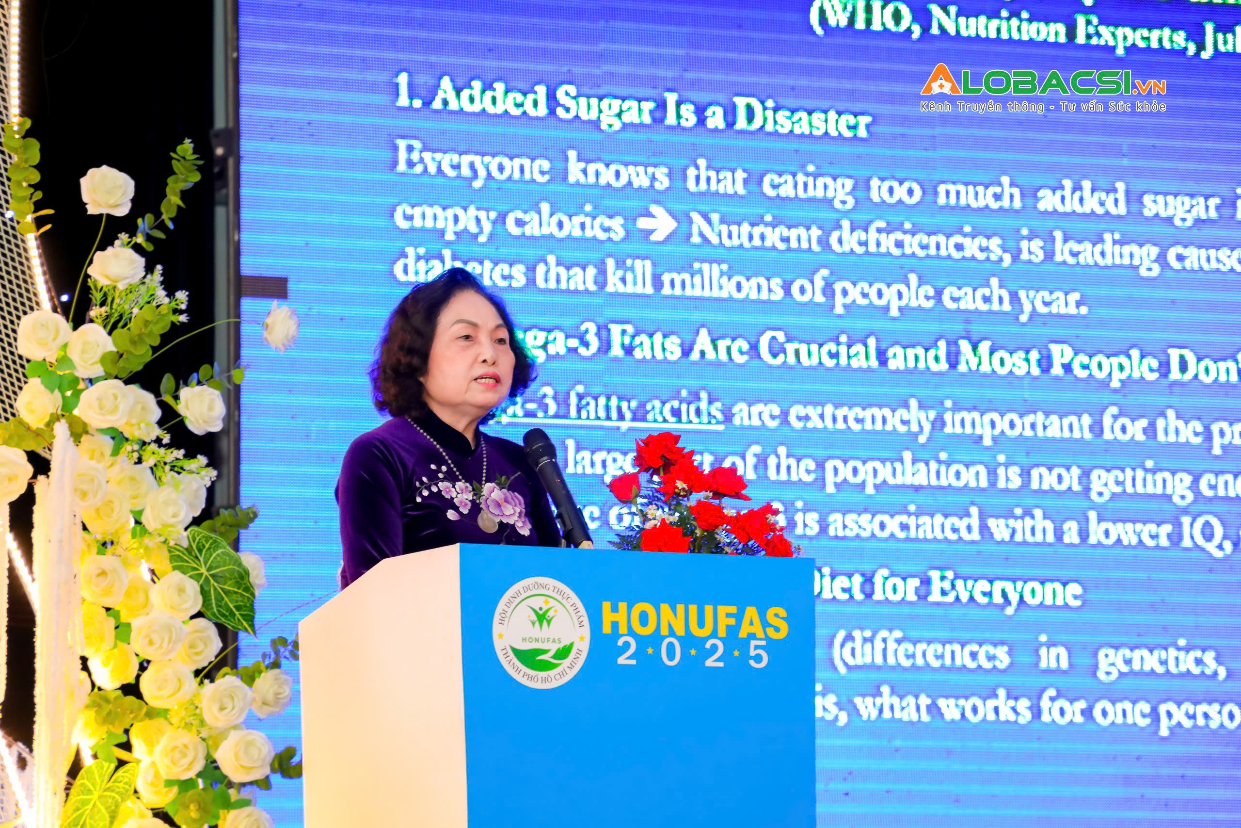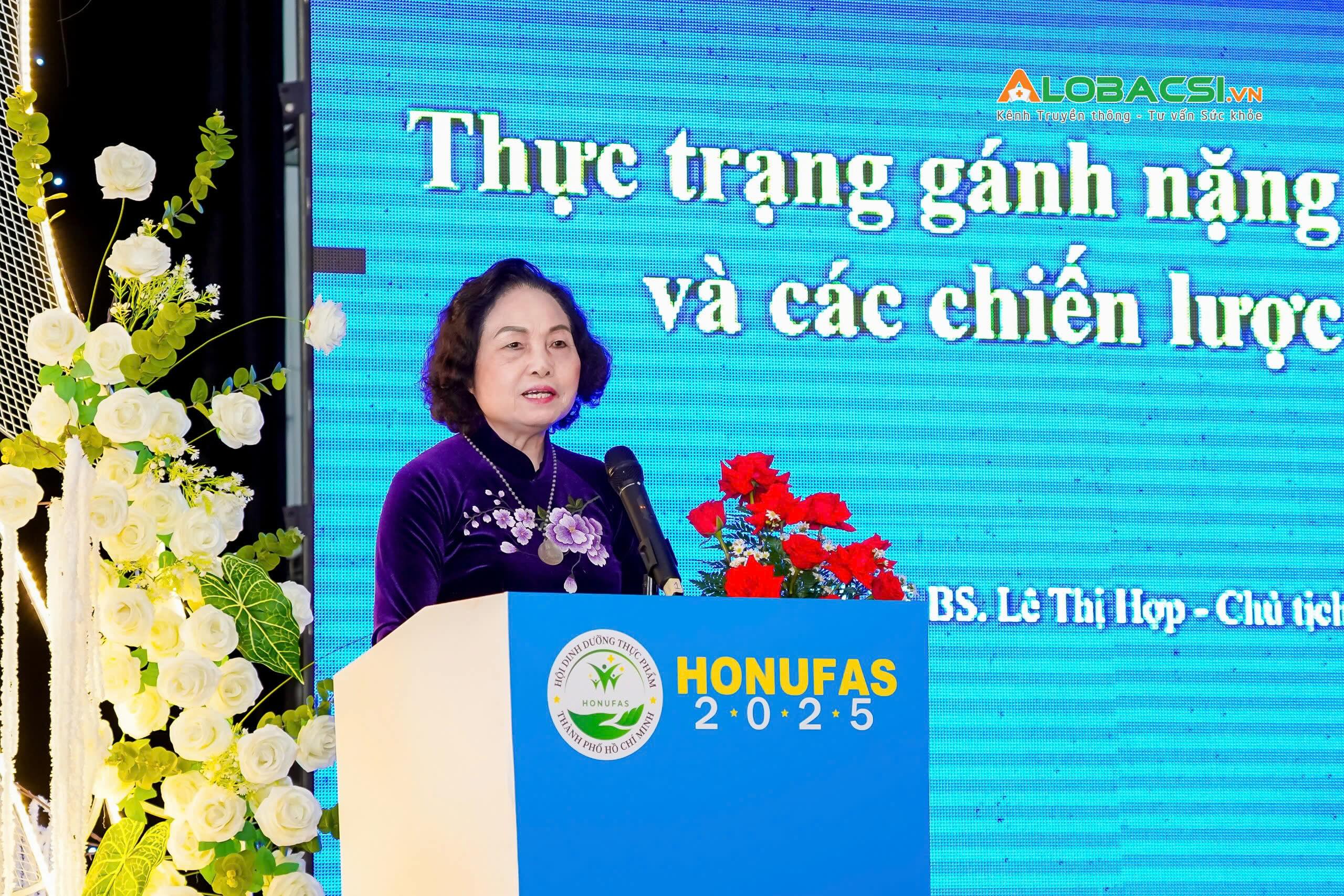 GS.TS.BS Lê Thị Hợp trình bày báo cáo tại Hội nghị Dinh dưỡng TPHCM mở rộng lần thứ XIII, nhấn mạnh ba thách thức lớn trong dinh dưỡng tại Việt Nam: thiếu dinh dưỡng, thiếu vi chất và thừa cân béo phì