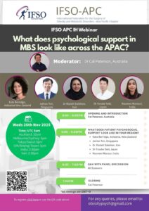 Hướng dẫn về Phẫu thuật điều trị béo phì khuyến nghị hỗ trợ tâm lý cho tất cả bệnh nhân trải qua phẫu thuật. Tuy nhiên sự hỗ trợ này như thế nào ở các khu vực có nhiều khác biệt. Trong hội thảo trực tuyến do IFSO-APC tổ chức, năm diễn giả được mời từ khắp Châu Á – Thái Bình Dương sẽ  giúp trả lời các câu hỏi sau: Chăm sóc tâm lý xã hội thường bao gồm những gì; Thách thức quan trọng nào trong việc cung cấp dịch vụ chăm sóc tâm lý xã hội cho bệnh nhân; Rào cản văn hóa hoặc xã hội quan trọng nào đối với việc chăm sóc tâm lý cho bệnh nhân trong khu vực. Sau các bài báo cáo sẽ có phần Hỏi & Đáp và thảo luận về chủ đề này.